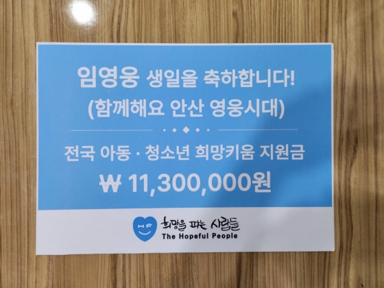 '함께해요 안산 영웅시대'는 "임영웅과 전국의 영웅시대가 펼치고 있는 선한 영향력을 이어가고자 2022년 5월부터 2023년 5월 말까지 자발적으로 모은 성금 1130만원을 임영웅 생일을 맞아 임영웅이 무명 때부터 기부했던 희망을 파는 사람들에 기탁했다"고 밝혔다.
