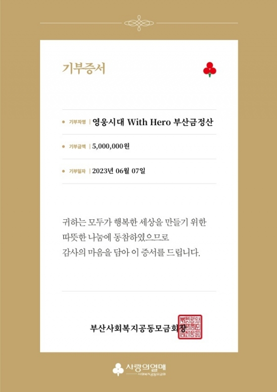 부산 사랑의열매 나눔리더스클럽 12호로 가입한 '영웅시대 WithHero 부산금정산'은 부산 금정구, 동래구, 기장군, 경남 양산시를 주축으로 모인 임영웅 팬클럽이다. '영웅시대 WithHero 부산금정산'이 2021년부터 기부금은 총 1600만 원 상당에 달한다.