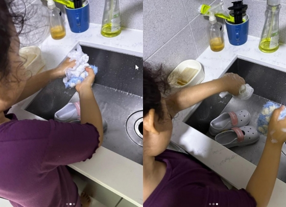 백지영은 14일 자신의 SNS를 통해 "신데렐라 놀이 하자길래 시켜버렸다. 점심 먹은 거 설거지랑 양말이랑 실내화 빨기. 정하임의 또 다른 재능을 찾았다"라는 글과 함께 세 장의 사진을 공개했다.