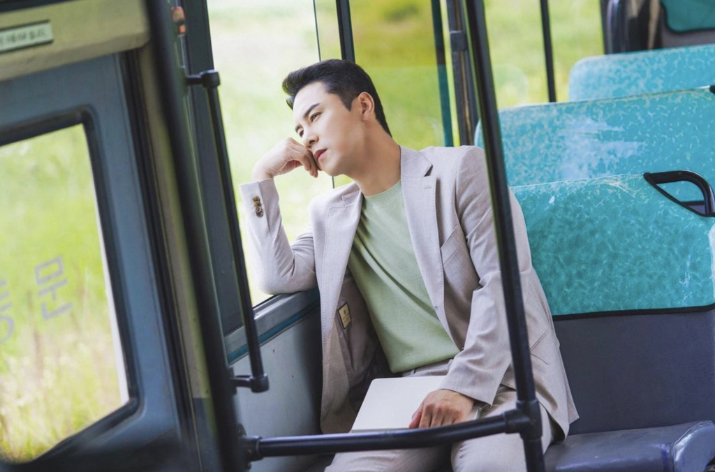 공개된 사진 속 장민호는 버스 안에서 베이지 슈트를 입고 창문에 기대어 바깥 풍경을 바라봤다.