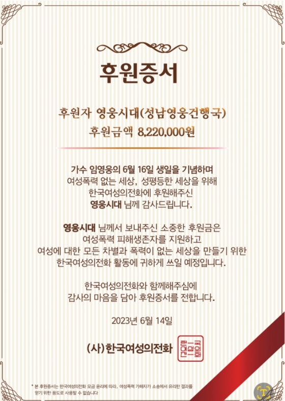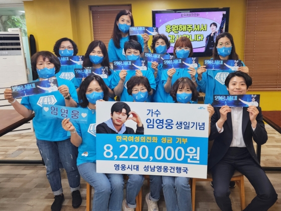 성남영웅건행국은 "임영웅의 남다른 봉사와 기부 정신을 생각하며 6월 16일 임영웅의 생일을 기념해 고통 받는 여성들의 삶에 보탬이 될 수 있는 한국여성의전화에 기부를 결정했다"고 밝혔다.