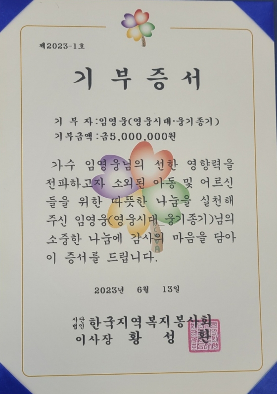 임영웅 팬클럽 영웅시대 웅기종기는 임영웅 생일(6월 16일)을 맞아 6월 13일 한국지역복지봉사회(이사장 황성환)에 후원금 500만 원을 전달했다.