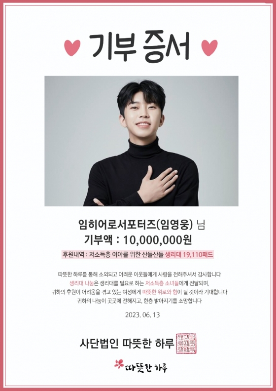 임영웅 팬클럽 '임히어로서포터즈'는 저소득층 소녀를 위해 1000만 원을 사단법인 따뜻한 하루에 기부했다고 15일 밝혔다.