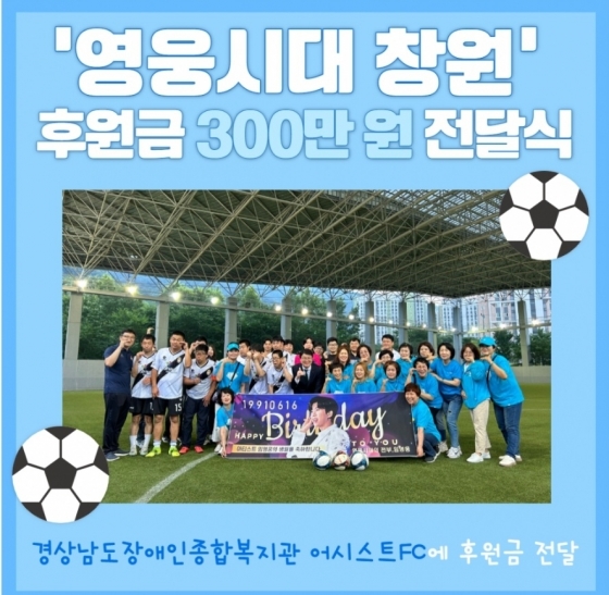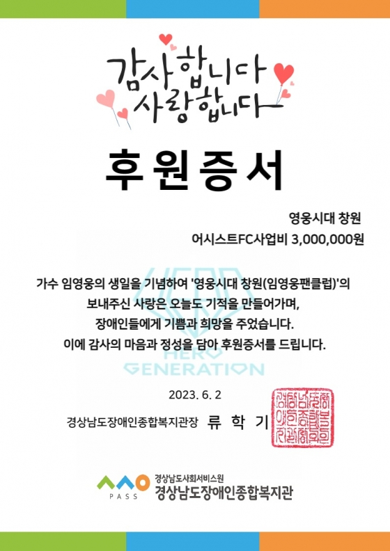 임영웅 팬클럽 '영웅시대 창원은 임영웅의 33번째 생일(6월 16일)을 맞아 경상남도 장애인종합복지관(관장 류학기)에 6월 14일 후원금 300만 원을 전달했다. 후원금은 경상남도 장애인종합복지관에서 운영하는 어시스트 FC 지원에 쓰일 예정이다.