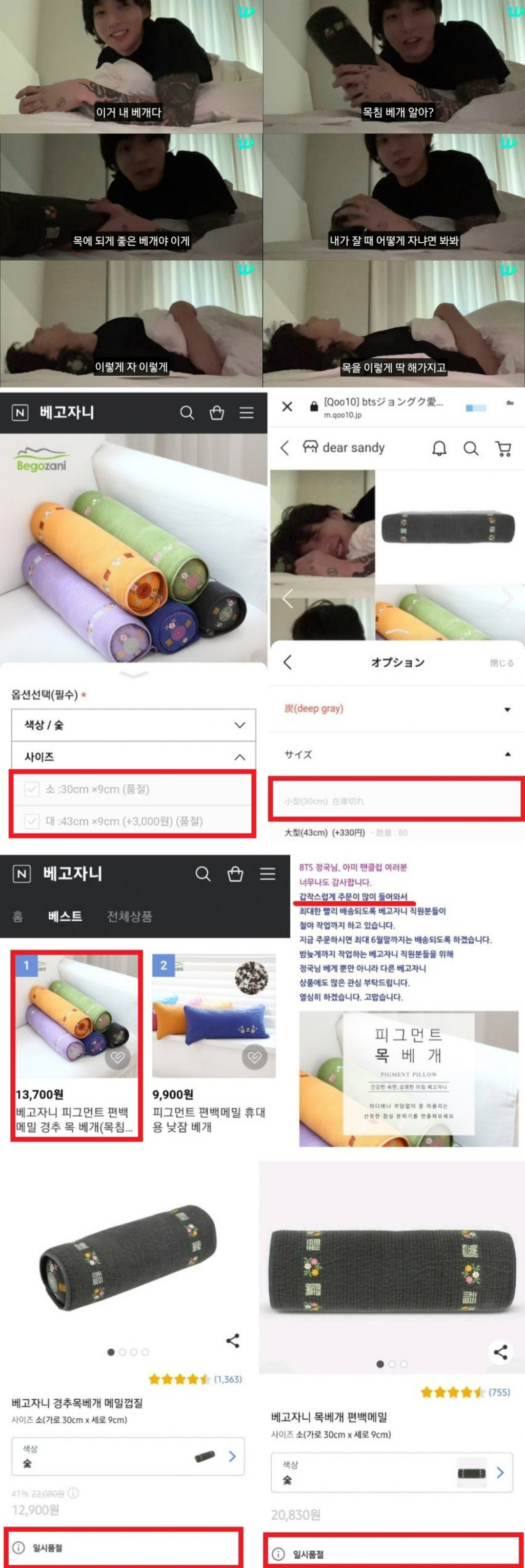 방탄소년단(BTS) 정국의 말 한마디에 목침 베개가 한국과 이본에서 줄줄이 품절되며 '정국 효과'를 입증했다.