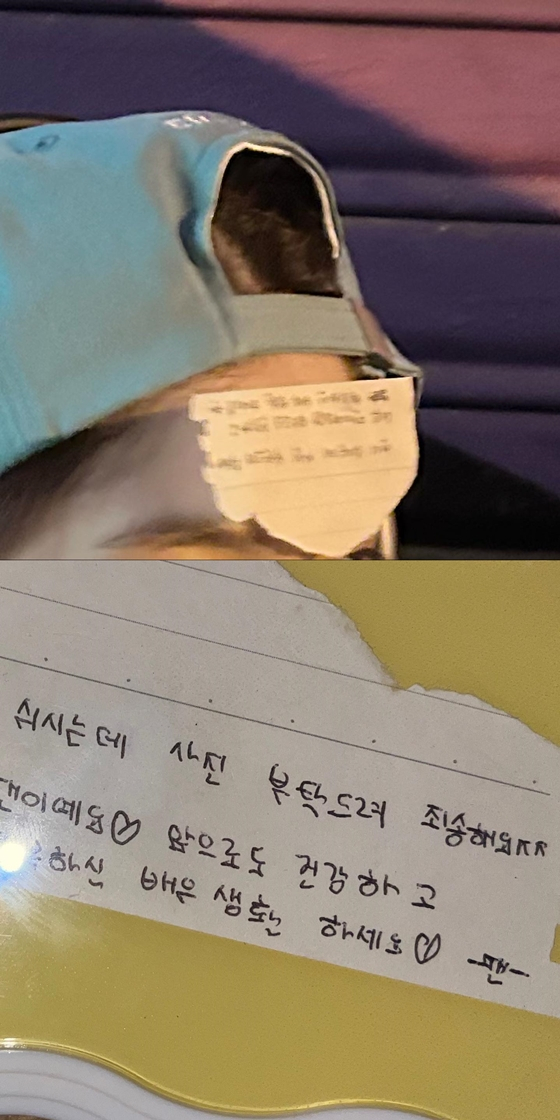 공개된 사진에는 한소희가 이마에 쪽지를 붙이고 있는 모습이 담겼다. 이어 다른 사진에는 '쉬시는데 사진 부탁드려 죄송해요' '팬이예요♥ 앞으로도 건강하고' 등과 그녀의 배우 생활에 응원을 하는 내용이 담겼다. 팬이 전한 쪽지였다.