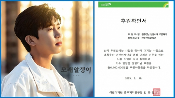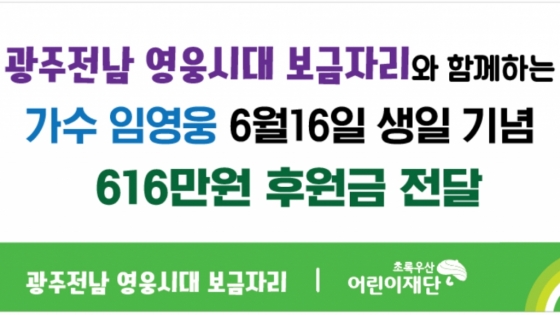 임영웅 팬클럽 광주전남 영웅시대 보금자리는 임영웅 33번째 생일(6월 16일)과 신곡 '모래 알갱이' 발매를 축하하며 광주광역시내 취약 계층 아동 지원을 위해 초록우산 어린이재단 광주지역본부(본부장 김은영)에 후원금 616만 원을 6월 13일 전달했다.