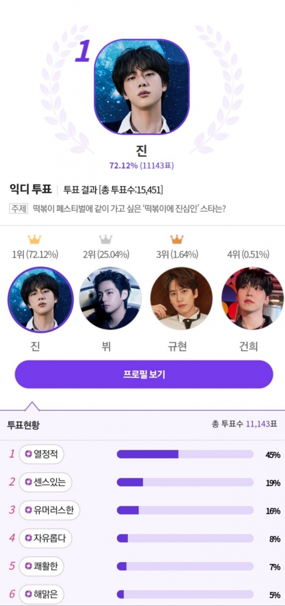방탄소년단(BTS) 진이 '떡볶이 페스티벌에 같이 가고 싶은 스타' 1위에 오르며 인기를 빛냈다.