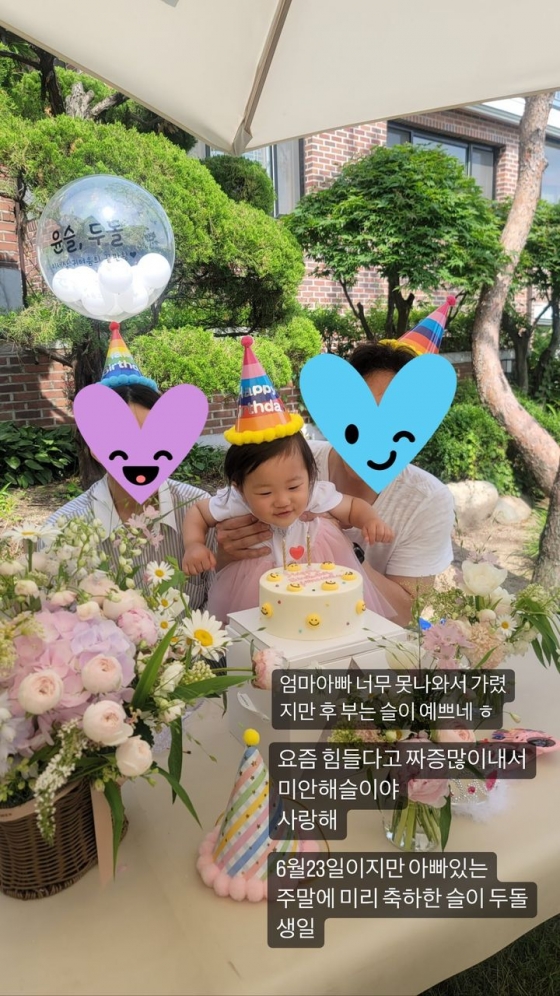공개된 사진 속에는 가족이 모여 생일 파티를 즐기고 있는 한지혜와 남편, 딸의 모습이 담겨있다. 특히 생일 초를 불며 행복한 미소를 짓고 있는 한지혜 딸의 모습이 미소를 자아낸다. 이어 "6월 23일이지만 아빠 있는 주말에 미리 축하한 슬이 두돌 생일"이라고 덧붙였다.