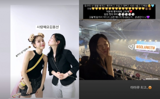 콘서트 무대 뒤에서 솔라와 함께 찍은 사진을 공개한 박소담은 "용선아 넌 정말 멋지고 섹시하고 귀엽고 이쁘고 사랑스럽고 다 했음"이라며 "덕분에 행복했다. 고마워"라며 애정을 표현했다.