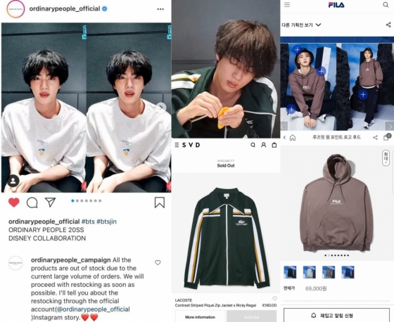 '라이프 고즈 온(Life Goes On)' 뮤직 비디오, 'Butter'(버터) 스페셜 퍼포먼스 등 수많은 영상에서 진이 착용한 '아템포'의 '실키 파자마', '반스(VANS)' 운동화 'Authentic 44 DX' 등 패션 상품들이 보여지자마자 빠르게 품절됐고 진의 셀카 속 아이템인 '포도알 목걸이'를 포함, 진이 공항이나 브이라이브 등에서 착용하거나 광고를 통해 선보인 패션 또한 초고속 품절 사태를 일으키며 진의 독보적인 영향력을 증명했다.