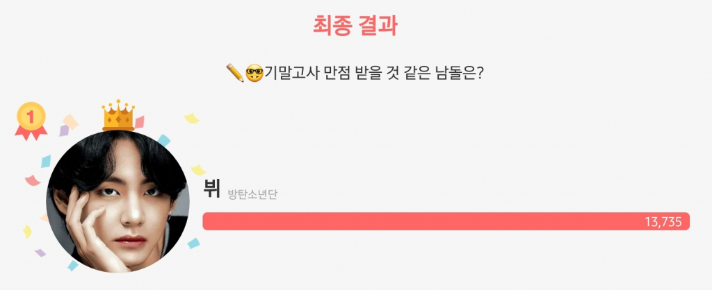 뷔는 6월 13일부터 19일까지 최애돌에서 진행된 '기말고사 만점 받을 것 같은 남돌은?'설문에서 1위를 차지했다.