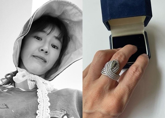 이와 함께 공개된 사진에는 윤현숙이 선물 받은 물방울 다이아몬드 반지를 자랑하는 모습이 담겨 있다. 큼지막한 다이아가 이목을 모은다.