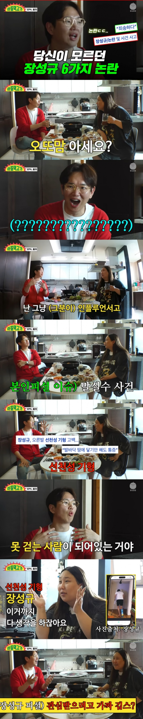 이어 장성규는 말 실수 사건도 꺼냈다. "나쁜 일도 아닌데 내가 말을 실수한 게 아닌가라는 생각이 들었다"는 장성규는 "최근에 다리를 다쳤었다. 몰랐는데 선천성 기형이라고 하더라. 그걸 '선천적 기형으로 이렇게 아픈 걸 수 있다는 얘기를 들었다'라고 SNS에 올렸다. 이후 '장성규 선청성 기형'으로 기사가 쫙 났다. 내가 못 걷는 사람이 돼있더라"고 이야기했다.