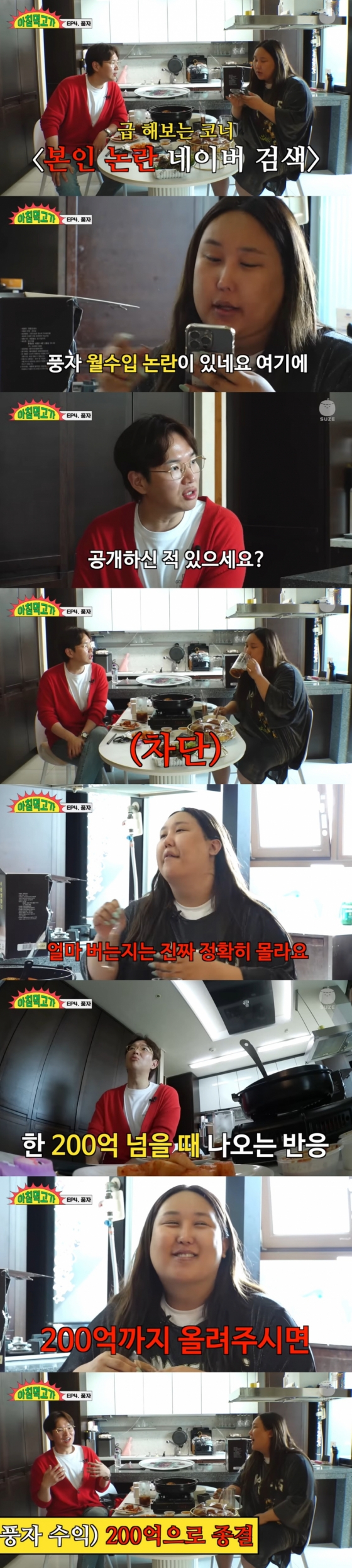 그러자 장성규는 "한 200억 넘을 때 나오는 반응이다"라며 풍자를 치켜세웠고, 풍자는 "아니 갑자기 저를 그렇게 200억까지 올려주시면 (어떡하냐). 이렇게 논란이 생기는 거다. 풍자 200억 논란"이라며 웃었다.