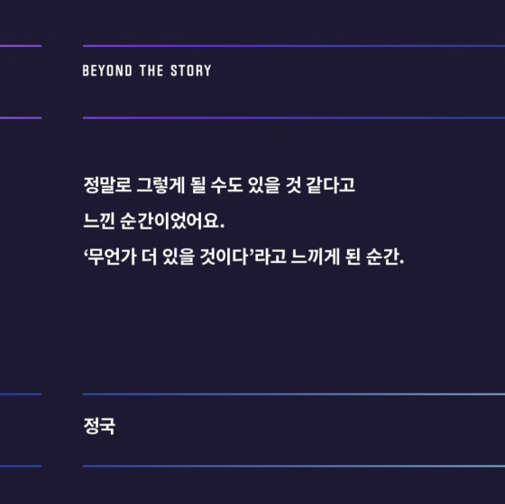 정국은 "정말로 그렇게 될 수도 있을 것 같다고 느낀 순간이었어요. '무언가 더 있을 것이다' 라고 느끼게 된 순간" 이라는 특별한 의미가 담긴 코멘트를 남겼다.
