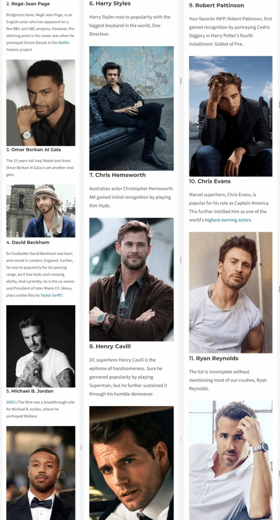 DC 슈퍼히어로 '슈퍼맨'으로 유명하며 고전적인 정석 미남인 영국 배우 헨리 카빌은 8위에 올랐다. '트와일라잇' 시리즈, '배트맨' 등의 히트작 배우인 로버트 패슨이 9위, 마블 슈퍼히어로 '캡틴 아메리카' 크리스 에반스가 10위를 차지했으며 마지막 11인으로 '데드풀'의 감독이자 주연인 캐나다 출신 라이언 레이놀즈가 이름을 올렸다.
