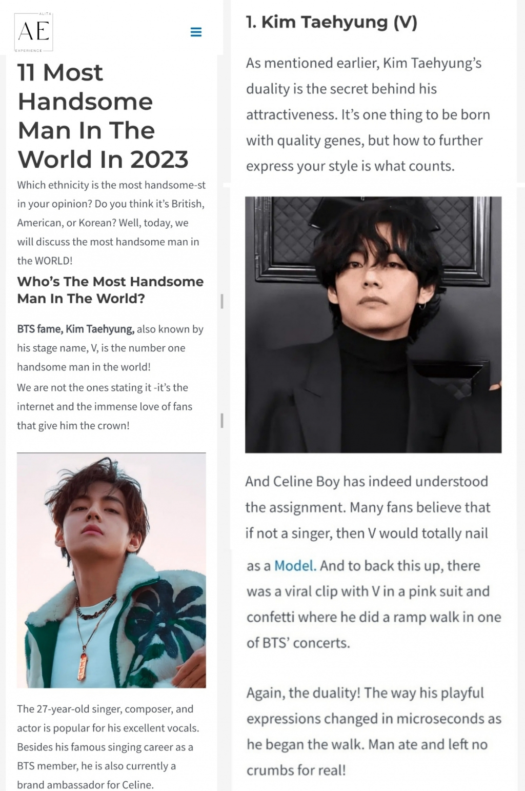 미국 미디어 AE(Alita Experience)는 '2023년 가장 잘생긴 남자 11'에서 뷔를 전 세계에서 가장 잘생긴 남자 1위로 선정했다.