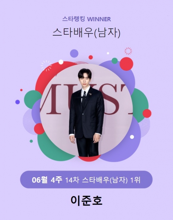 이준호는 지난 6월 22일 오후 3시 1분부터 6월 29일 오후 3시까지 진행된 6월 4주(14차) 스타랭킹 스타배우 남자 랭킹 투표에서 1만 7459표를 얻으며 1위를 차지했다.