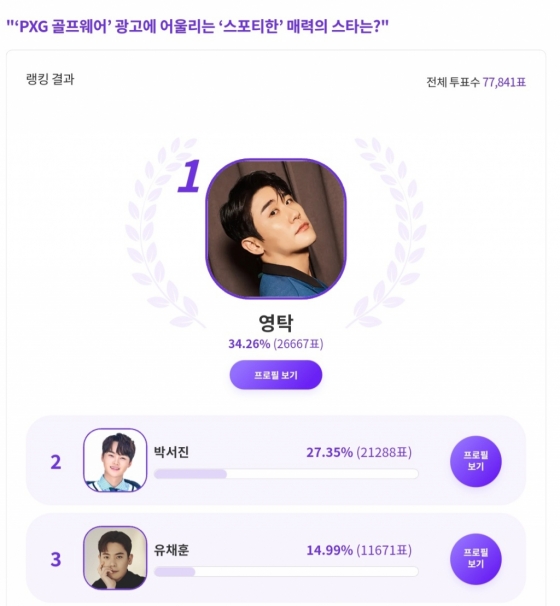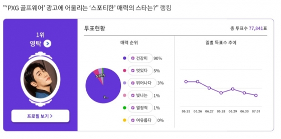 영탁은 6월 25일부터 7월1일까지 익사이팅디시에서 진행된 "PXG 골프웨어' 광고에 어울리는 '스포티한' 매력의 스타는?' 설문에서 1위를 차지했다.