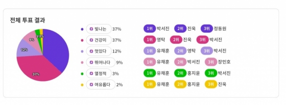영탁의 매력으로는 건강미가 90%로 1위에 꼽혔다. 이어 멋있다 5%, 뛰어나다 3%, 빛나는 1%, 열정적 1% 순이었다. 영탁의 대표 이미지는 '진심을 다하는'으로 나타났다.