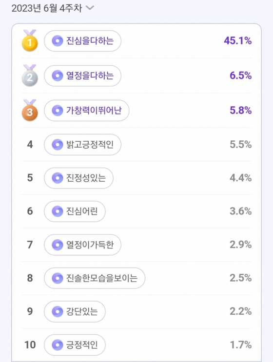 대중이 선택한 2023년 6월 4주차 영탁의 매력 키토크 TOP 10은 '진심을 다하는', '열정을 다하는', '가창력이 뛰어난', '밝고 긍정적인', '진정성 있는', '진심 어린', '열정이 가득한', '진솔한 모습을 보이는', '강단 있는', '긍정적인'이었다.