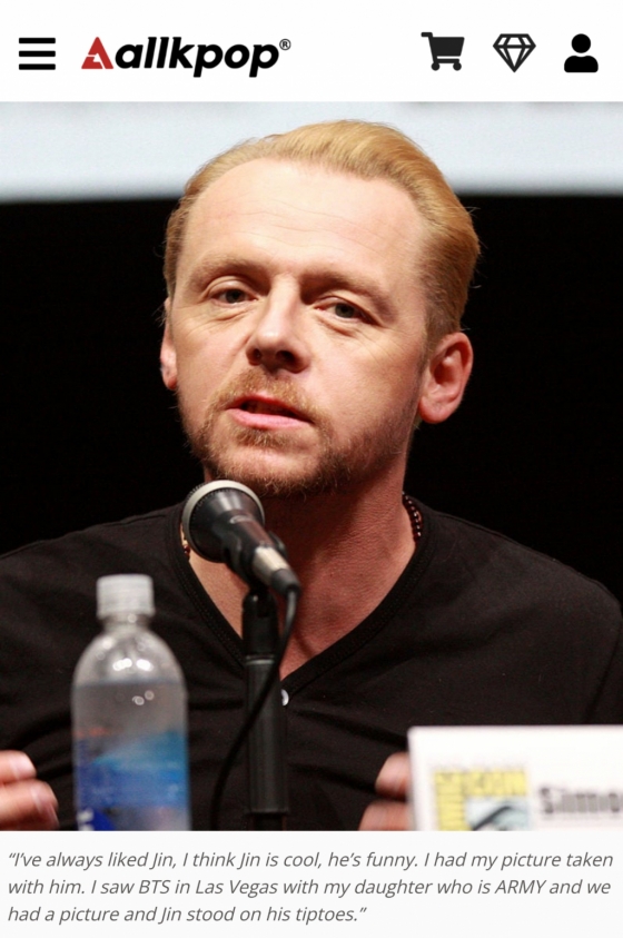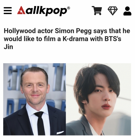 북미 매체 올케이팝(Allkpop)은 "할리우드 배우 사이먼 페그, 영화 '미션 임파서블 데드 리코닝' 서울 시사회에서 방탄소년단 진 언급"이라는 기사로 소식을 전했다.