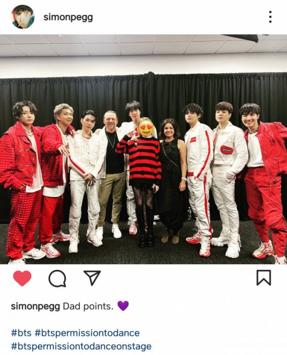 '미션 임파서블' 시리즈에서 벤지 던 역으로 유명한 사이먼 페그는 레드카펫에서 진행된 인터뷰에서 방탄소년단의 멤버 진에 대한 마음을 표현했다. 방탄소년단 중 최애 멤버는 누구인가라는 리포터의 질문에 진이라고 답한 것. 그는 1년 전 진과의 만남을 훈훈하게 회상하며 자신의 10대 딸 또한 방탄소년단의 팬인 아미라고 언급하기도 했다.