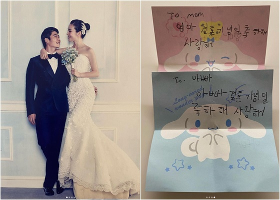 또 한혜진은 이와 함께 엄마 아빠의 결혼 기념일을 축하하는 아이의 손편지까지 공개하며 감동을 전했다.