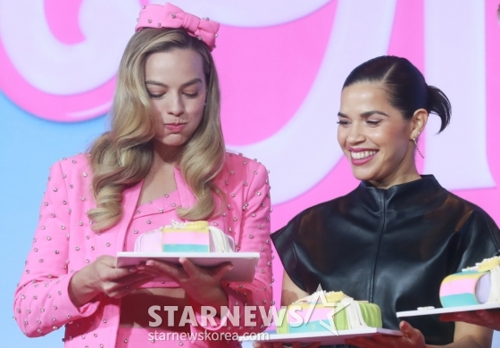 배우 마고 로비, 아메리카 페레라가 3일 오전 서울 포시즌스 호텔에서 진행된 영화 '바비'(감독 그레타 거윅) 기자간담회 참석해 떡케이크 선물을 받고 기뻐하고 있다.