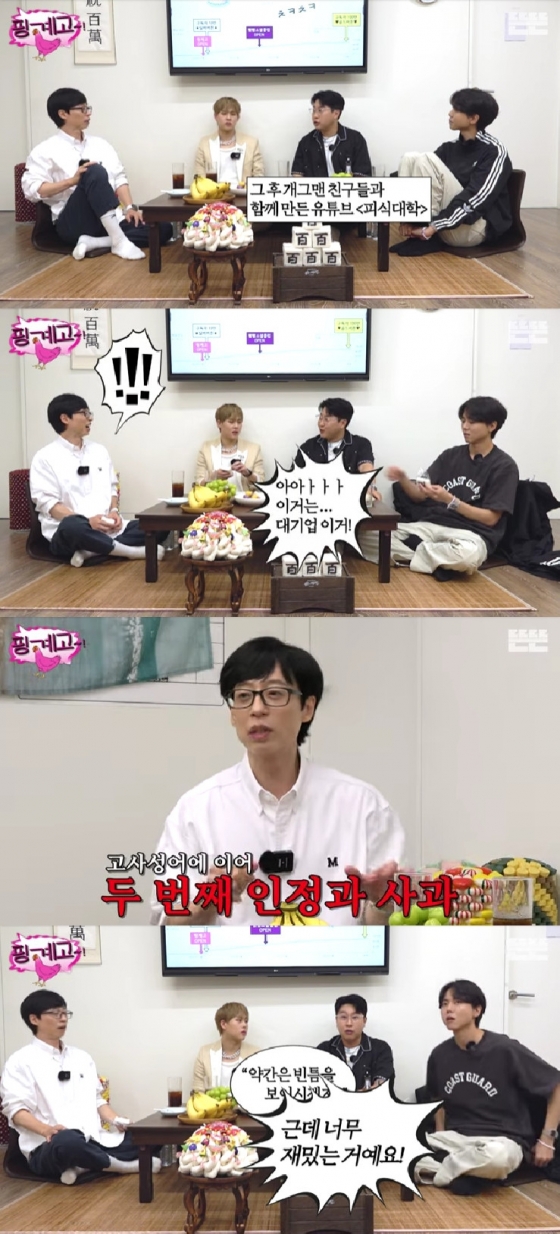 이에 유재석은 "본의 아니게 큰 결례를 했다. 이 채널이 열릴 때도 조심스럽긴 했는데 기존에 활동하신 분들께는 죄송하다"고 사과했고, 주우재는 "저한테도 사과해달라. 저도 3년 전에 채널을 개설했다"고 요구했다. 유재석은 "제가 주우재 씨 채널이 있다는 걸 안 지 얼마 안 됐다. 피식대학은 미리 알고 있었다"고 덧붙여 웃음을 안겼다.