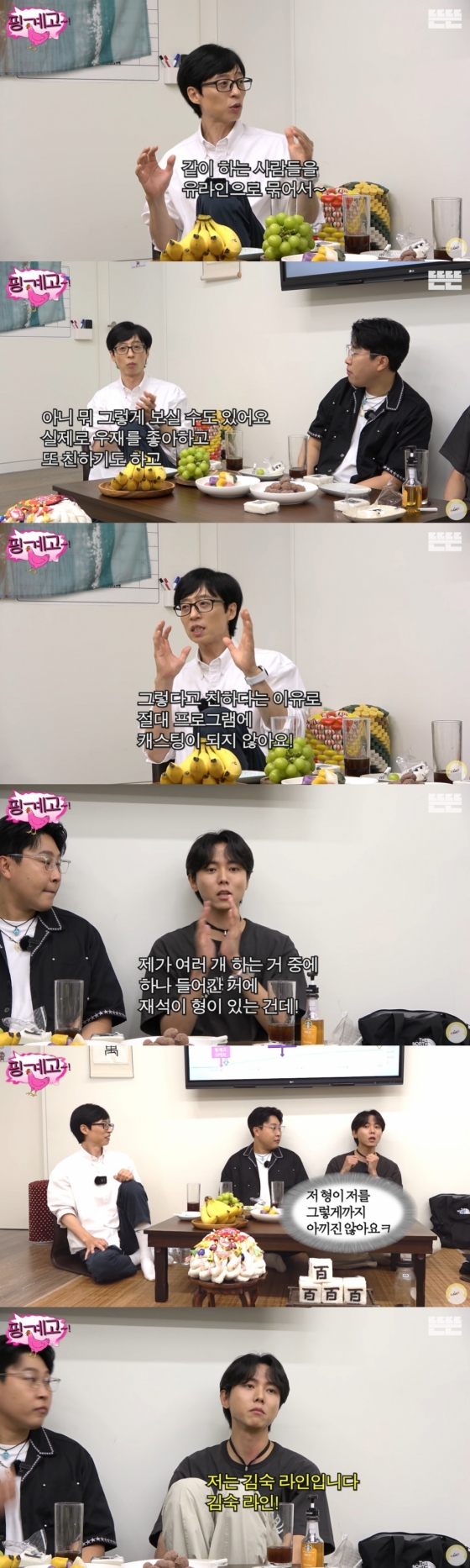 또한 유재석은 "사실 라인이라고 하는 것도 웃음의 소재로 라인 이야기를 우리끼리도 하고 했지만 그런 라인은 없다. 만약 그런 일을 벌인다면 누군가 SNS에 올릴 거다. 어쨌든 주우재는 유라인이 아니다"라고 털어놨고, 주우재는 "어디 꽂아준다고 생각하는데 전혀 아니다"라고 강조했다.