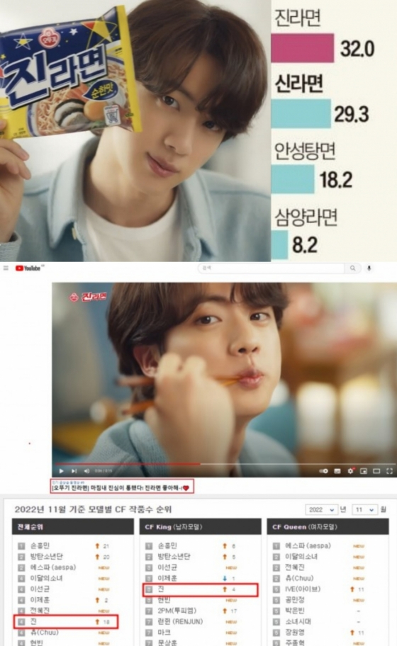 진은 한국광고총연합회 광고정보센터가 공개한 지난해 11월 CF모델 랭킹 결과 공동 4위를 차지했다. 남자 모델 순위에서는 공동 3위에 올랐다. 진라면 단 한 광고로 이룬 이례적인 결과다.