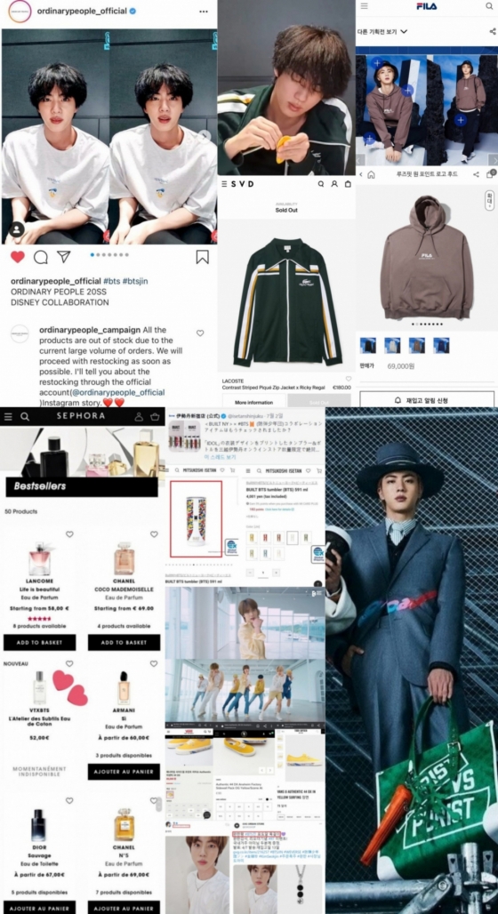 군복무 중에도 '솔드아웃킹'의 면모를 자랑하는 진은 광고 상품은 물론 착용한 패션 상품, 먹고 마시는 식품 등 관련된 상품들이 초고속 품절 행진을 일으키는 것으로 정평이 나 있다.
