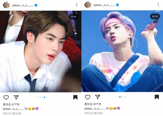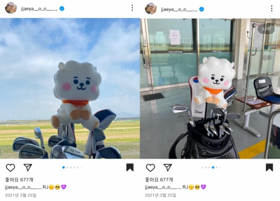 김재희 골퍼의 인스타그램에는 진이 만든 캐릭터인 알제이(RJ)와 진의 사진이 게재돼있어 오랜 팬임을 실감케했다.