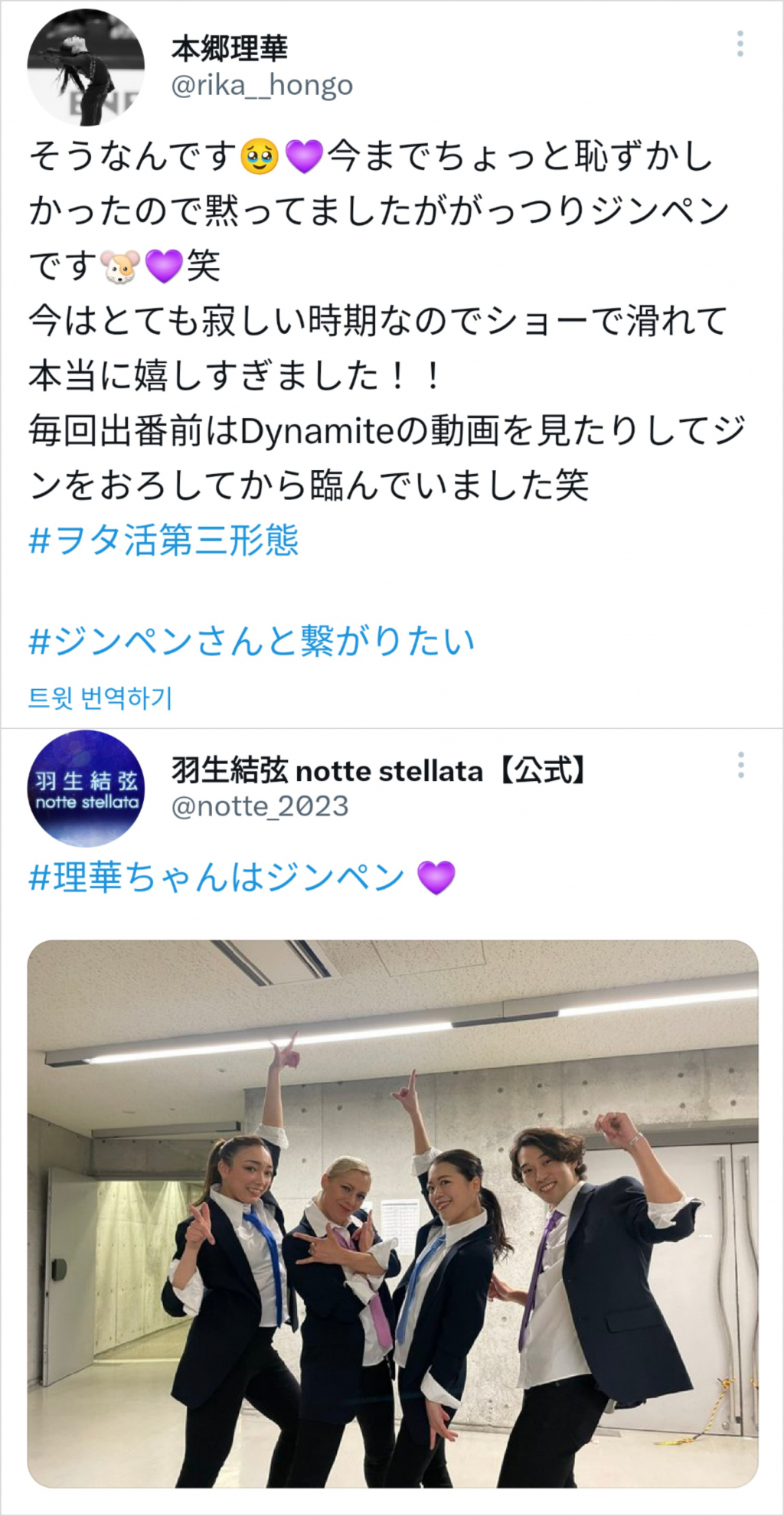 4대륙 피겨스케이팅 선수권 대회 동메달리스트 2회, 2014-15 일본 국가대표 은메달리스트 등 화려한 경력의 일본 피겨 선수 홍고 리카 또한 최근 '하뉴 유즈루 notte stellata(아이스쇼)' 공식 트위터에 홍고 리카와 동료 선수들의 다이너마이트 안무 사진과 함께 #리카는진팬 라는 해시태그가 게시된 글을 리트윗하며 진이 최애임을 고백했다. 홍고 리카는 "맞아요. 지금까지 조금 수줍어서 말 안하고 있었지만 완전 진 팬입니다. 지금은 (진의 군입대로 인해) 굉장히 외로운 시기인데 쇼에서 스케이트 공연을 할 수 있어서 정말 기뻤어요. 매번 출연 전에 '다이너마이트' 동영상을 보거나 해서 진을 강림받아 (힘을 내서) 경기에 임하고 있어요"라고 말하며 애정을 드러냈다.