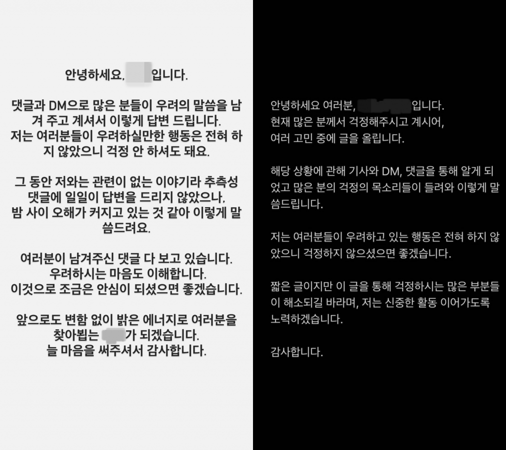또 다른 유튜버 J씨 역시 같은날 개인 SNS에 "현재 많은 분께서 걱정해 주시고 계셔서 여러 고민 중에 글을 올린다. 해당 상황에 관해 기사와 DM, 댓글을 통해 알게 되었고 많은 분의 걱정의 목소리들이 들려와 이렇게 말씀드린다. 나는 여러분들이 우려하고 있는 행동은 전혀 하지 않았으니 걱정하지 않으셨으면 좋겠다"라고 고백했다.