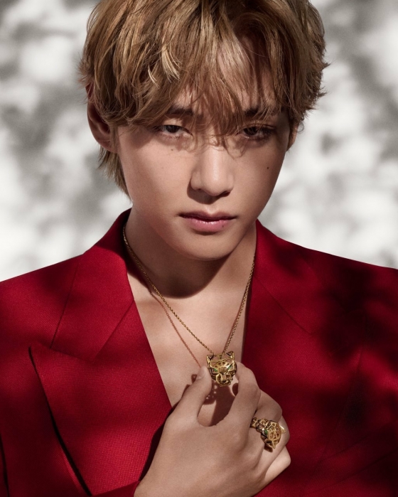 까르띠에가 공개한 화보에서 뷔는 레드 슈트를 착용하고 까르띠에의 상징적인 팬더 주얼리를 착용하고, 표범을 연상시키는 강렬하고 매혹적인 눈빛으로 범접할 수 없는 아우라를 발산해 까르띠에의 선택이 완벽함을 증명했다.