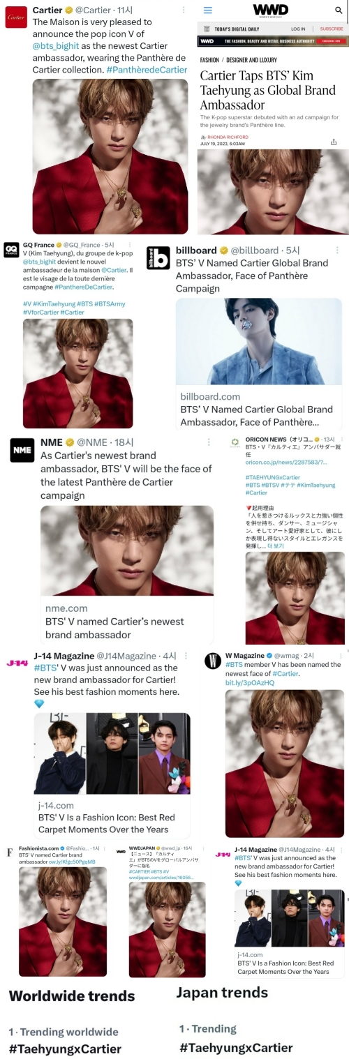뷔가 까르띠에 글로벌 앰버서더가 된 사실이 전해지자 #TAEHYUNGxCartier가 월드와이드 실시간 트렌드 1위에 올랐으며, 까르띠에는 100만 이상의 언급량을 기록하는 등 전 세계 SNS을 뜨겁게 달궈 흥행보증수표로서 존재감을 입증했다.