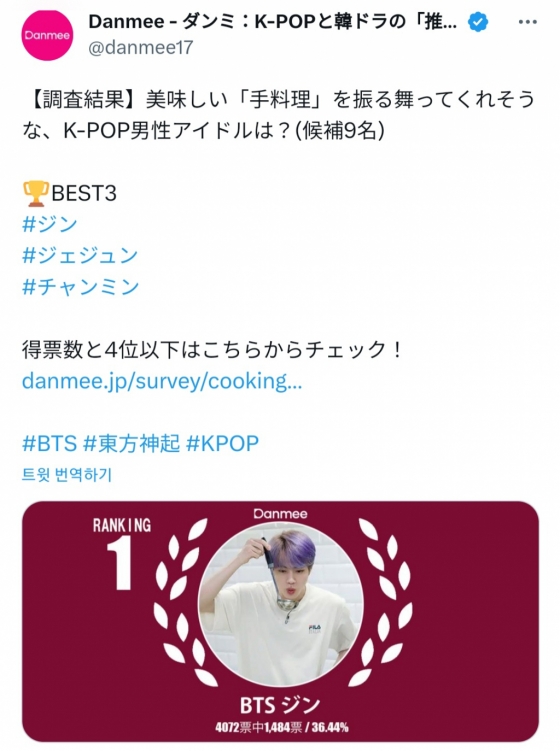 방탄소년단(BTS) 진이 일본에서 '맛있는 손수 만든 요리를 대접해 줄 것 같은 K팝 남자 아이돌'1위에 오르며 뜨거운 인기를 빛냈다.