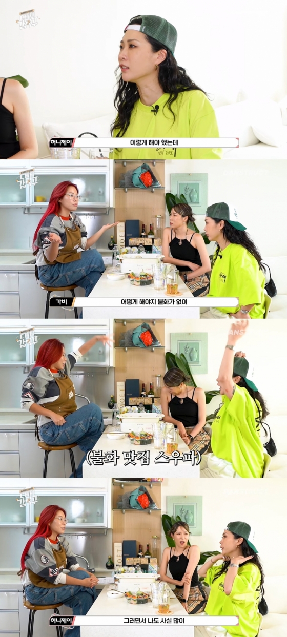 가비는 "궁금한 게 있다. 제자 뻘인 팀원들이랑 불화 없이 잘 지내냐"라고 물었다. 이에 허니제이는 "멤버들의 몫도 크다. 걔네가 뭘 하든 내버려 둬야 한다. 그걸 받아들이기 시작하니까 애들이 더 편해하더라. 요즘은 내 앞에서 비속어도 한다. 원래는 아예 못했다. 사실 '스우파' 때 나에 대한 안 좋은 얘기할 때 깜짝 놀랐다. 내 앞에서는 '네' '네' 하는데 애들이 한숨 쉬고 답답해한다"라며 "갑자기 그때 난리가 한번 났었다. 내가 아니라 얘네끼리 난리가 나겠다 싶었는지 PD님이랑 작가님한테 문자를 이만큼 보낸 거다. 그걸 새벽에 작가님은 받아서 화가 엄청났다. 그래서 피디님이 '너희가 말한 걸 내보낸 건데 이게 무슨 악마의 편집이냐'라고 했다. 새벽에 긴급 소집하듯이 다 모여서 면담했다. 울고불고 난리가 났었다"라고 고백했다.