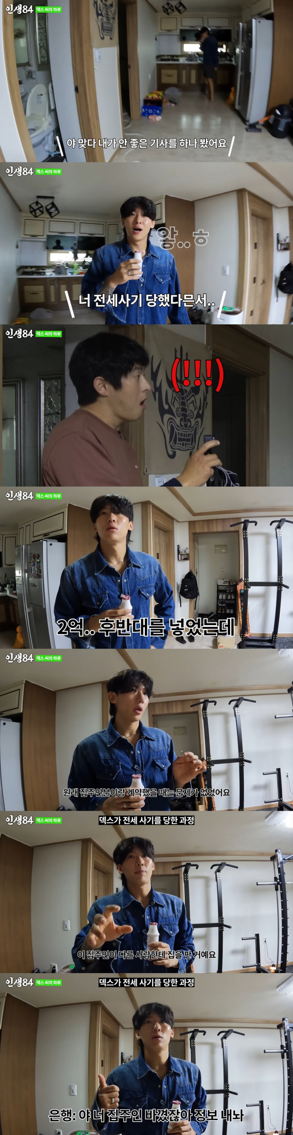 기안84는 덱스의 하루를 관찰하기 위해 덱스의 집을 찾았다. 그러던 중 기안84는 "내가 안 좋은 기사를 하나 봤다. 너 전세 사기 당했다면서?"라며 조심스럽게 입을 열었다. 이에 덱스는 "이 집이 그 집"이라면서 "얼마 정도 넣어놨었냐"라는 기안84의 말에 "2억 후반대를 넣었다. 원래 집주인이랑 계약했을 때는 문제가 없었다. 이 집주인이 다른 사람한테 집을 판 거다. 모르고 있다가 은행에서 전화가 왔다. '집주인이 바뀌었다. 정보를 내놔라'라고 하더라. '뭔 X소리야'라고 생각했다"고 말했다.