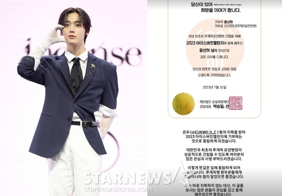 31일 윤산하는 "(차) 은우 형의 지목을 받아 2023 아이스버킷챌린지에 기부하는 것으로 동참하게 됐다"며 1000만원의 기부금을 전달했다고 밝혔다.