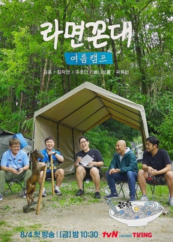 '라면꼰대 여름캠프'는 김풍, 이말년, 주호민, 빠니보틀, 곽튜브가 뭉쳐 캠핑을 진행하는 예능이다.