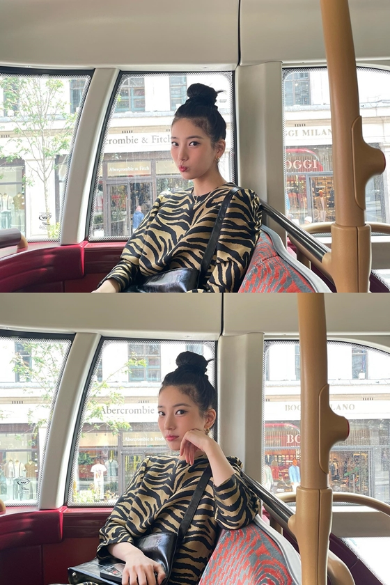 공개된 사진에는 수지가 올림머리 헤어스타일, 일명 '똥머리' 스타일에 얼룩무늬 의상을 입고 있다. 런던에서 여신 미모를 뽐내 시선을 사로잡았다. 새침하고, 깜찍한 다채로운 매력을 발산한 수지였다.