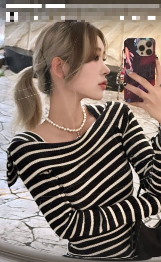 최준희는 쇄골이 살짝 보이는 스트라이프 상의를 입고 가는 목선과 베일 듯한 턱선을 강조한 포즈를 취하고 있다.