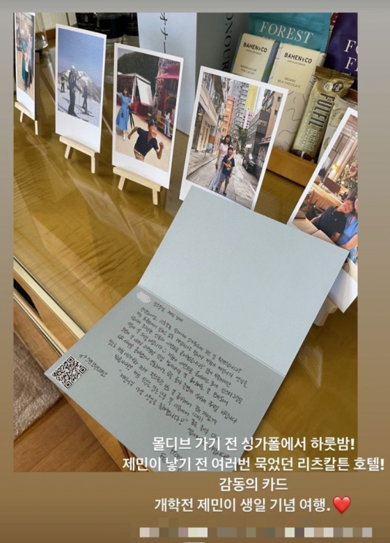 강수정은 "몰디브 가기 전 싱가폴에서 하룻밤! 제민이 낳기 전 여러번 묵었던 리츠칼튼 호텔! 감동의 카드 개학 전 제민이 생일기념 여행"이라고 적었다.