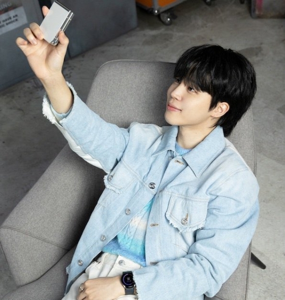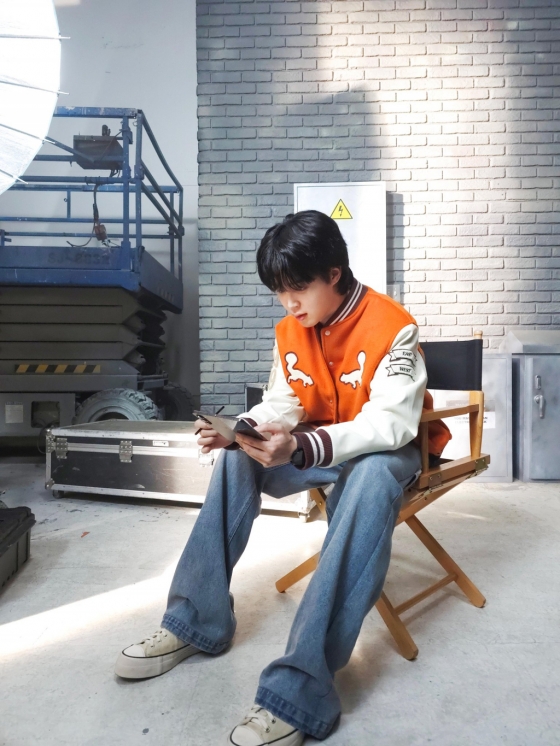 이어 공개된 또다른 화보에서는 오랜지색 바시티 재킷과 블루진, 컨버스를 매치해 풋풋하고 러블리한 새내기 비주얼로 펜을 든채 Z플립5를 집중해서 보고있는 모습으로 또 한번 팬심을 뒤흔들었다.
