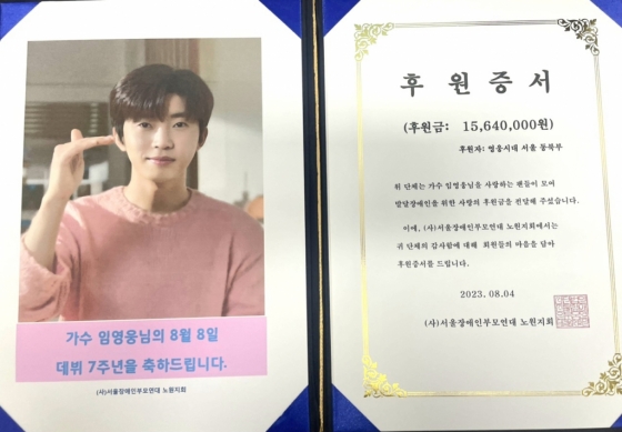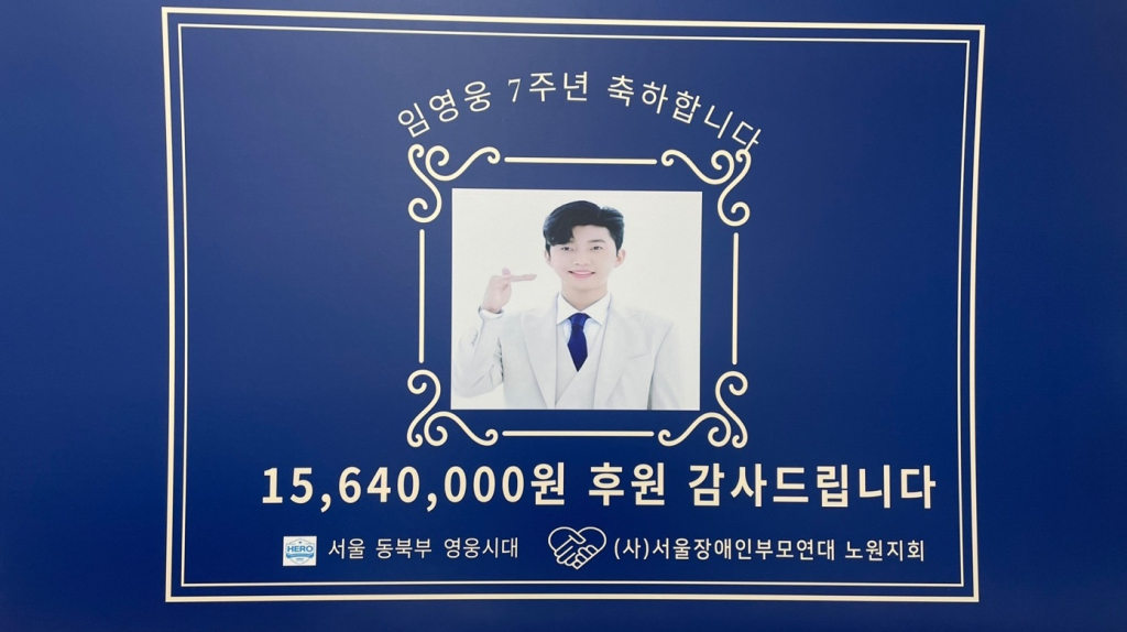 서울동북부영웅시대는 "임영웅 데뷔 7주년이라는 뜻깊은 날을 맞아 발달장애인들에게 꼭 필요한 부분에 우리의 작은 정성이 쓰였으면 하는 바람을 담아 기부했다"고 전했다.