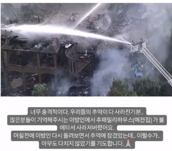 하원미는 10일 "너무 충격적이다. 우리의 추억이 다 사라진 기분. 많은 분이 기억해주시는 JTBC '이방인'에서 추패밀리 하우스가 불에 타 사라져버렸다"라며 "며칠 전 '이방인'을 다시 돌려보면서 추억에 잠겼는데 이럴 수가. 아무도 다치지 않았기를 기도한다"라고 직접 전했다.